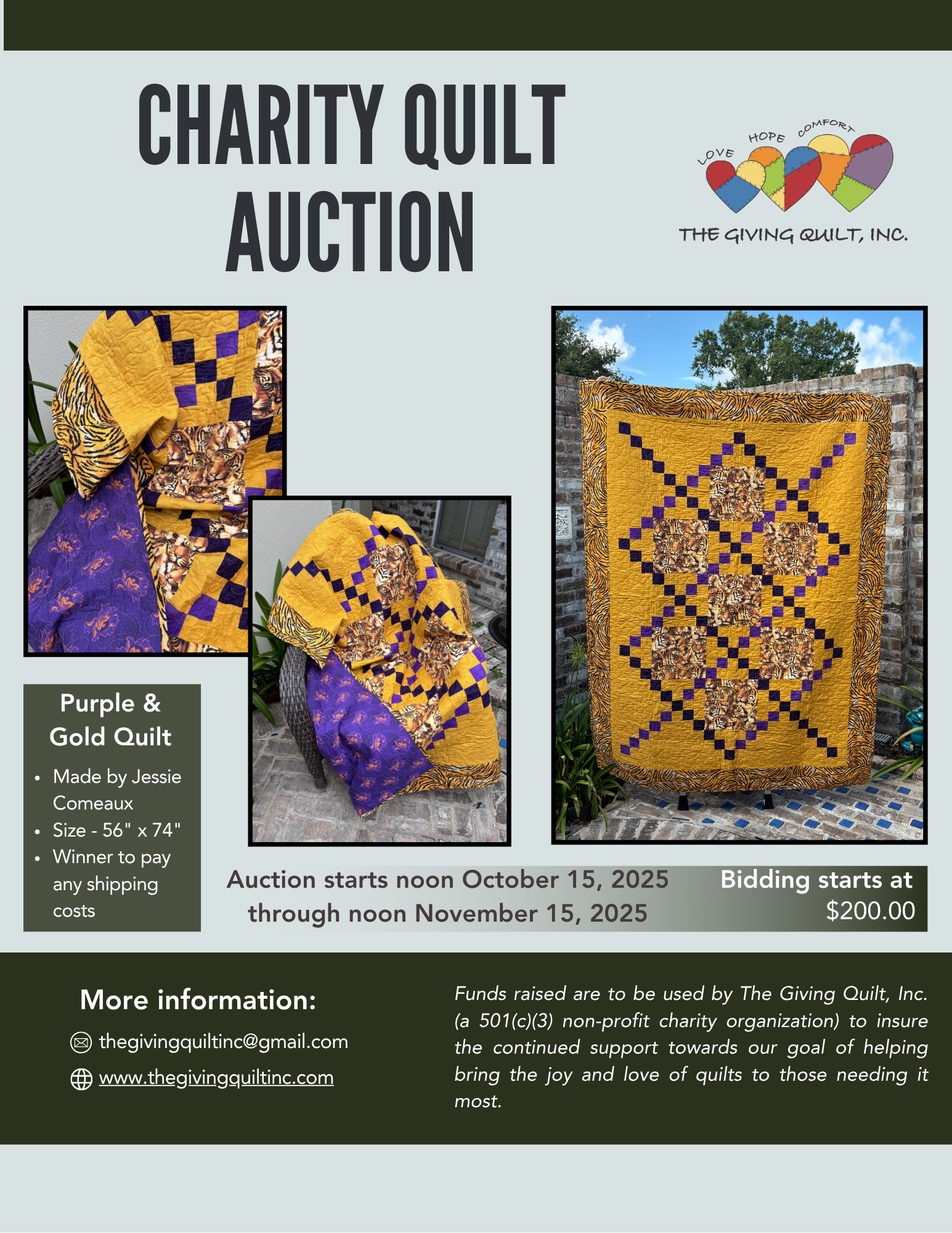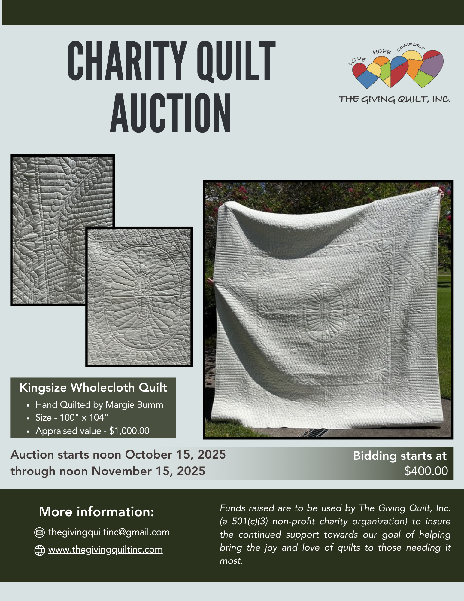 All funds raised are to be used by The Giving Quilt, Inc. (a 501(c)(3) non-profit charity organization) to insure the continued support towards our goal of helping bring the joy and love of quilts to those needing it most.
